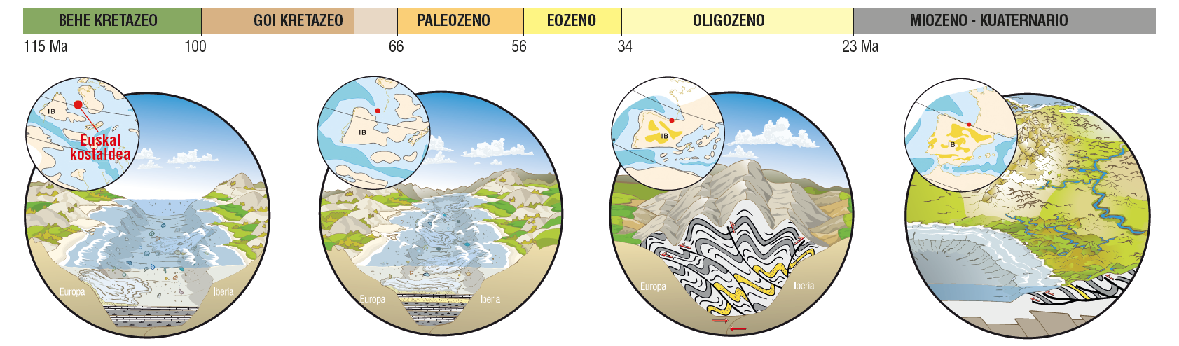 La península ibérica continuó su movimiento de rotación antihoraria y terminó de chocar con Eurasia, cerrando definitivamente el golfo de Bizkaia y levantando la cadena pirenaica. Los sedimentos marinos se deformaron en grandes pliegues y se fracturaron en fracturas y fallas. En el Geoparque podemos identificar importantes y variadas estructuras de deformación de diferente escala relacionadas con esta gran colisión.